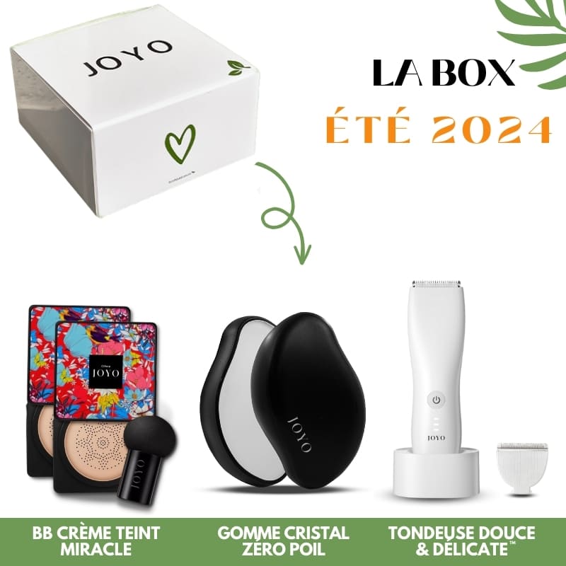 La box d'été contient la gomme cristal zéro poil qui élimine les poils sans douleurs ni coupures, grâce à son pouvoir exfoliant elle supprime tous vos poils incarnés, mais également les cellules mortes, le duvet et efface l’effet “jambes de fraise” révélant une peau lisse et douce. La box contient également la bb crème teint miracle qui masque les défauts pour tout type de peau, protège, hydrate, corrige et unifie le teint tout en gardant un rendu naturel et finalement la tondeuse douce & délicate™ pour raser ou taillez vos parties les plus délicates (maillot, aisselles) sans douleurs ou irritations grâce à son garde-coupe et sa technologie Anti-Accroc™️ à dents perlés.