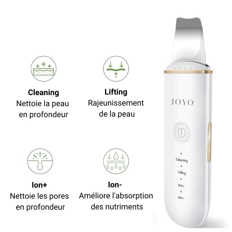 La spatule à vibrations pour le visage possède plusieurs fonctions : dissolvants de points noirs, peeling, lifting et cavitation. Ce produit est donc efficace et sûr pour nettoyer les pores, les points noirs, les peaux mortes, l'acné, l'absorption des nutriments, le massage du visage, l'élimination des rides, le resserrement de la peau.