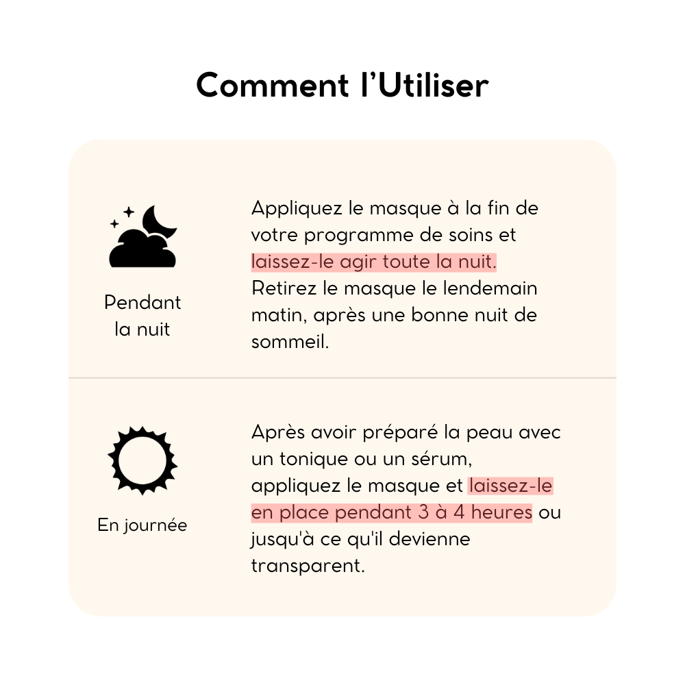 Pour une utilisation nocturne, incorporez le masque à la dernière étape de votre routine de soins de nuit. Pour une utilisation régulière, appliquez-le avant votre crème hydratante.