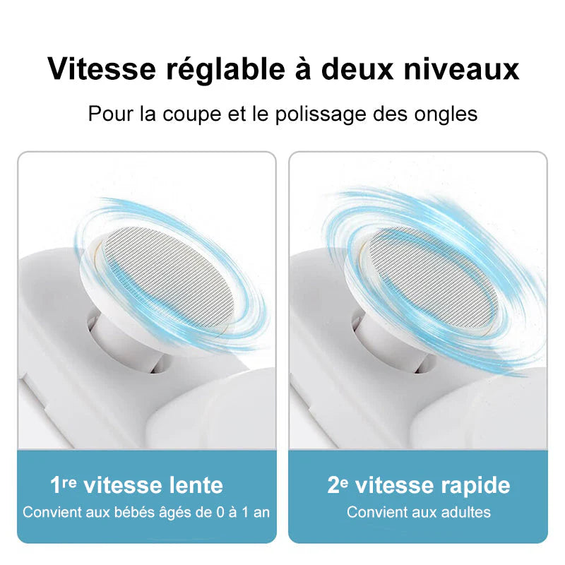 - Utilisation Facile pour Toute la Famille : Avec un fonctionnement à un bouton et deux vitesses réglables, ce coupe-ongles est parfait pour les adultes et les enfants. Pratique, sûr et facile à utiliser par tous.