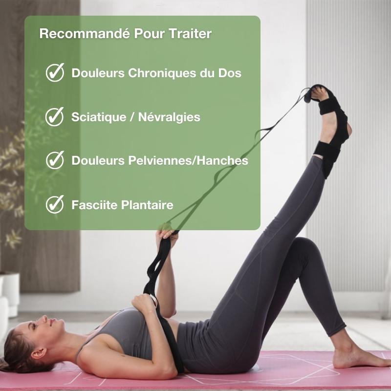 La Sangle anti-douleurs est spécialement conçue pour étirer en douceur les muscles du dos, des fesses, des ischio-jambiers, des quadriceps et des fléchisseurs de la hanche. En réduisant la tension dans ces muscles, elle aide à soulager les douleurs dorsales, la sciatique et les problèmes de mobilité.