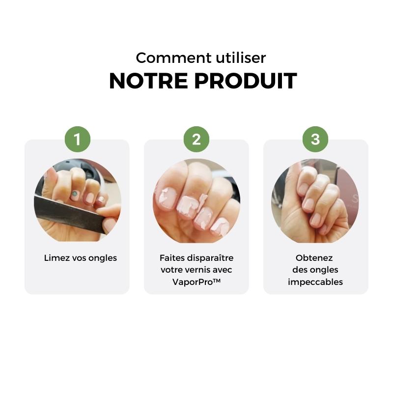 Éliminez votre vernis en toute simplicité. VaporPro assure un retrait sans douleur, sans risque pour vos ongles, et vous fait économiser en évitant les visites répétées en salon.